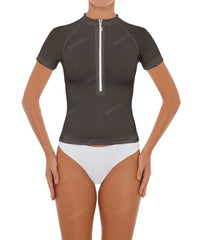 - Detail Feature: Short-sleeve rash guard with raglan sleeves and a half front zipper opening