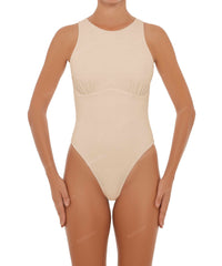 - Detail Feature: Sleeveless rash guard one-piece with a high round neck, curved and gathered bust detail, and a back zipper opening