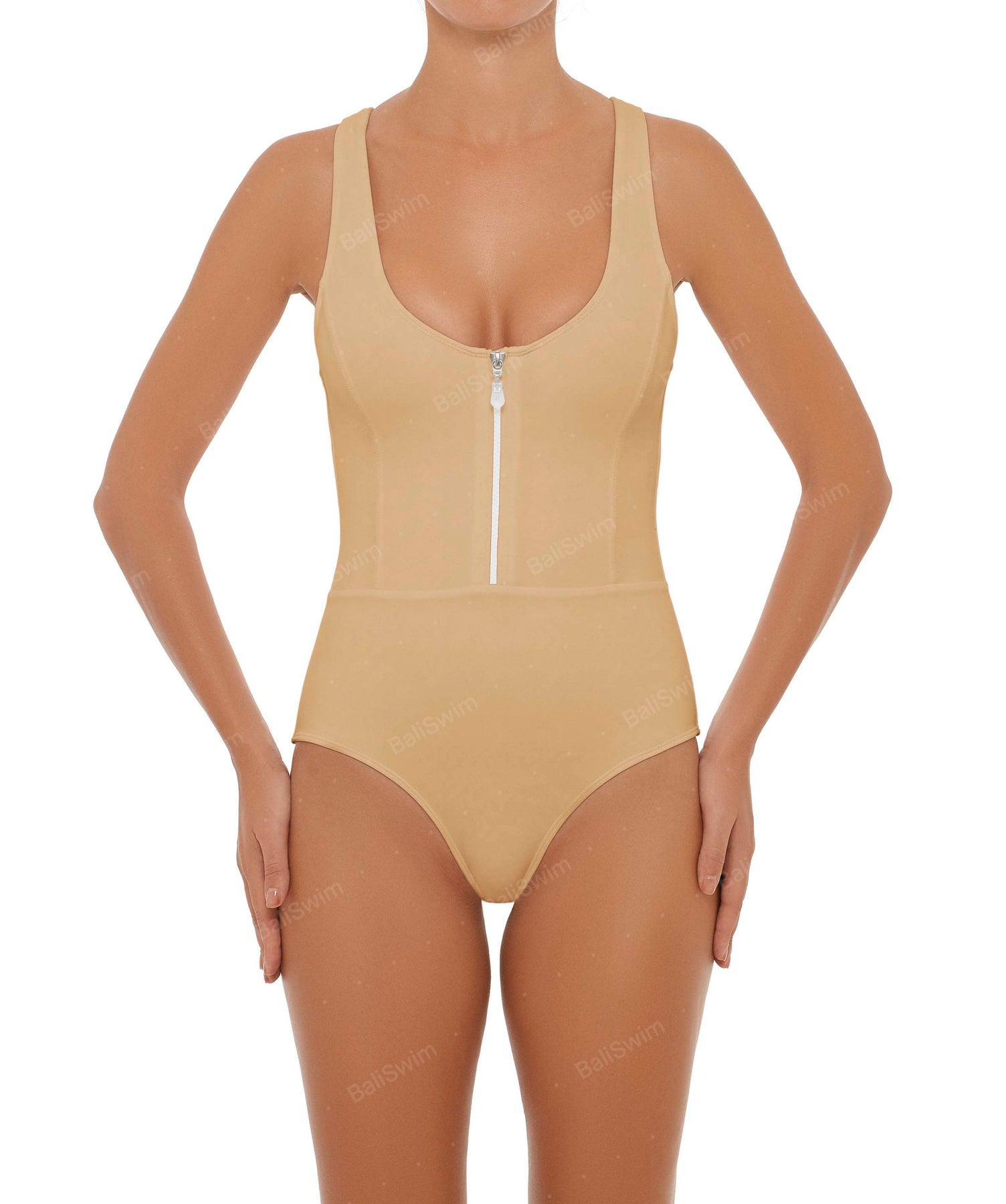 - Detail Feature: Sleeveless rash guard one-piece with a round neck, racerback, princess line detail, and a front zipper opening