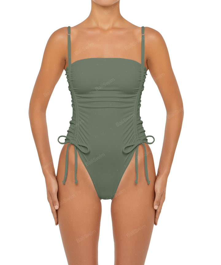 - Detail Feature: Square neck swimsuit, Adjustable gathered detail on princess line, Adjustable straps, Adjustable leg opening