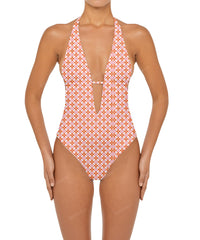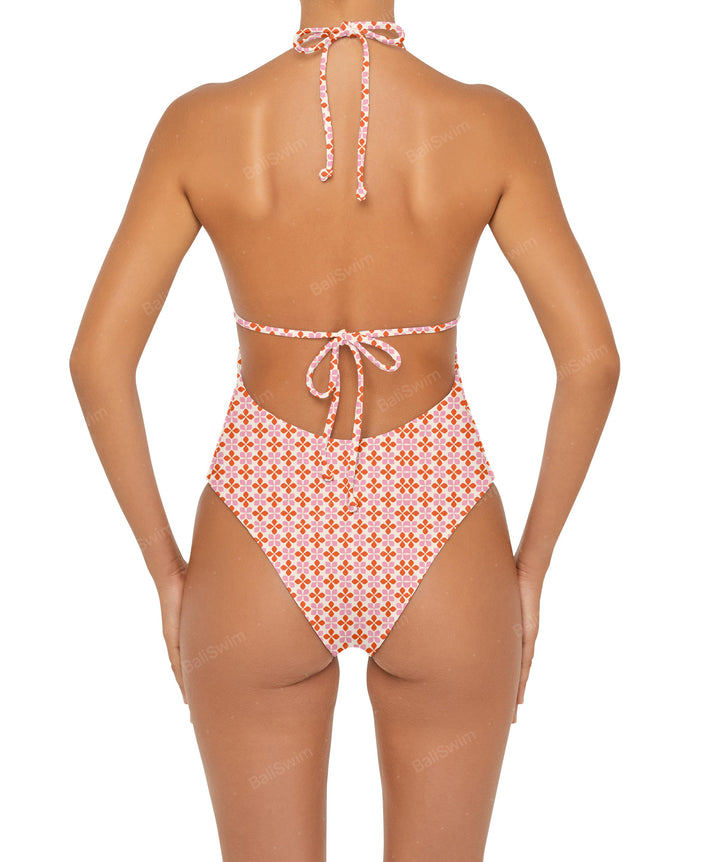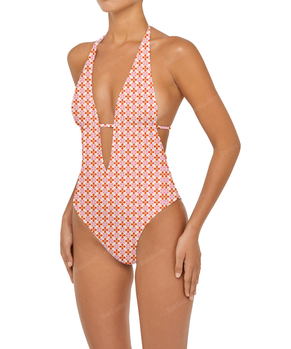 - Detail Feature: Plunge V-neck One piece, Halter ties, Adjustable underbust, Adjustable tie closure, Low back