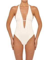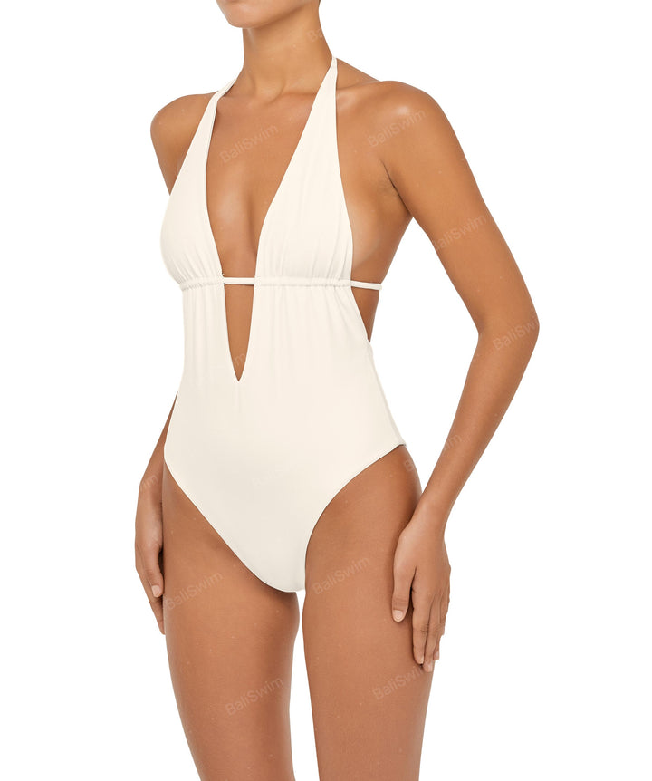- Detail Feature: Plunge V-neck One piece, Halter ties, Adjustable underbust, Adjustable tie closure, Low back