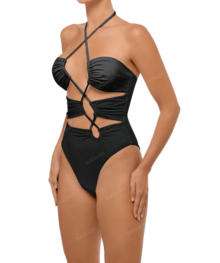 - Detail Feature: Asymmetric cut out one piece, Ruching detail, Adjustable criss cross halter neck