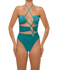 - Detail Feature: Asymmetric cut out one piece, Ruching detail, Adjustable criss cross halter neck
