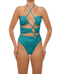 - Detail Feature: Asymmetric cut out one piece, Ruching detail, Adjustable criss cross halter neck