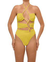- Detail Feature: Asymmetric cut out one piece, Ruching detail, Adjustable criss cross halter neck