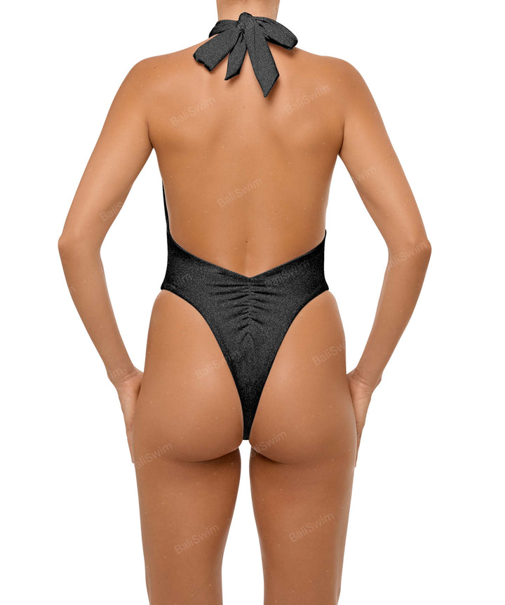 - Detail Feature: Halter cut out one piece, Adjustable halter ties, Criss cross neck, Ruched waist and side seam, Low V-waist, High cut, Low back