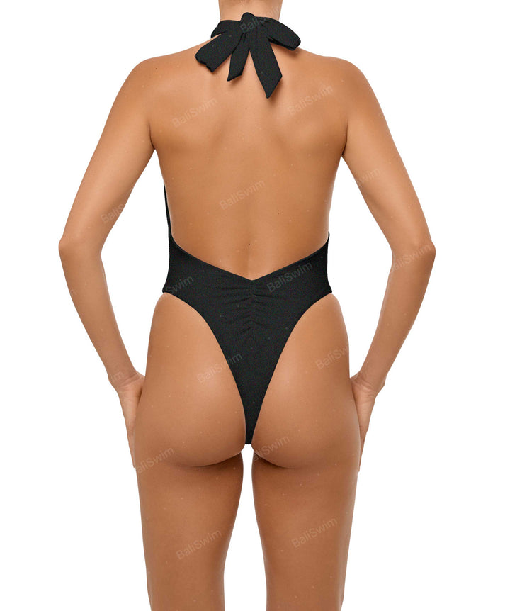 - Detail Feature: Halter cut out one piece, Adjustable halter ties, Criss cross neck, Ruched waist and side seam, Low V-waist, High cut, Low back