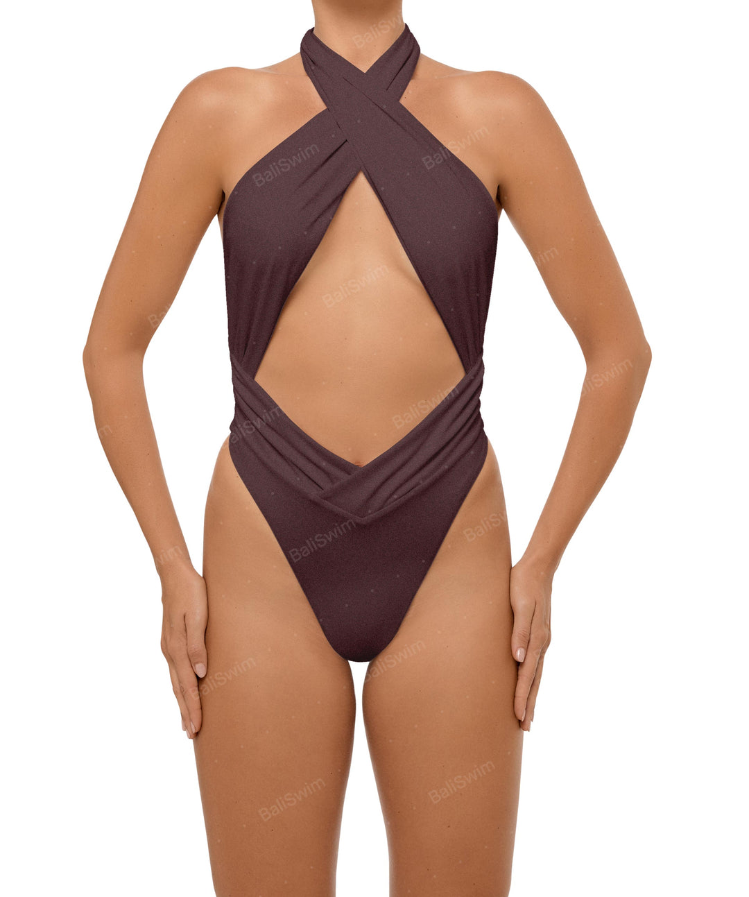 - Detail Feature: Halter cut out one piece, Adjustable halter ties, Criss cross neck, Ruched waist and side seam, Low V-waist, High cut, Low back