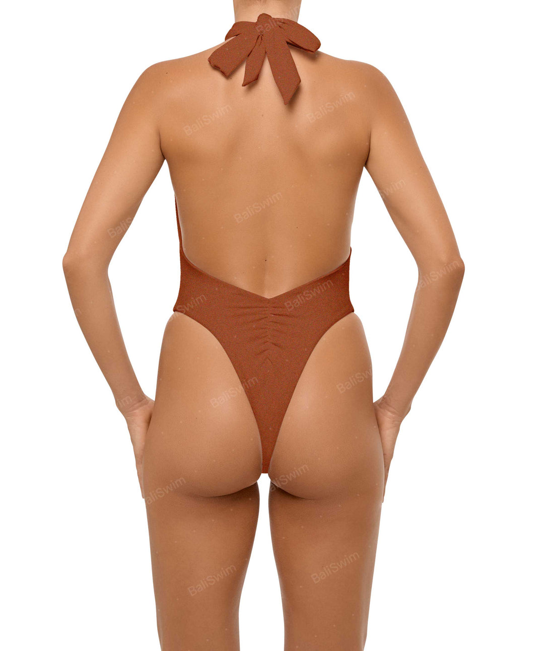 - Detail Feature: Halter cut out one piece, Adjustable halter ties, Criss cross neck, Ruched waist and side seam, Low V-waist, High cut, Low back