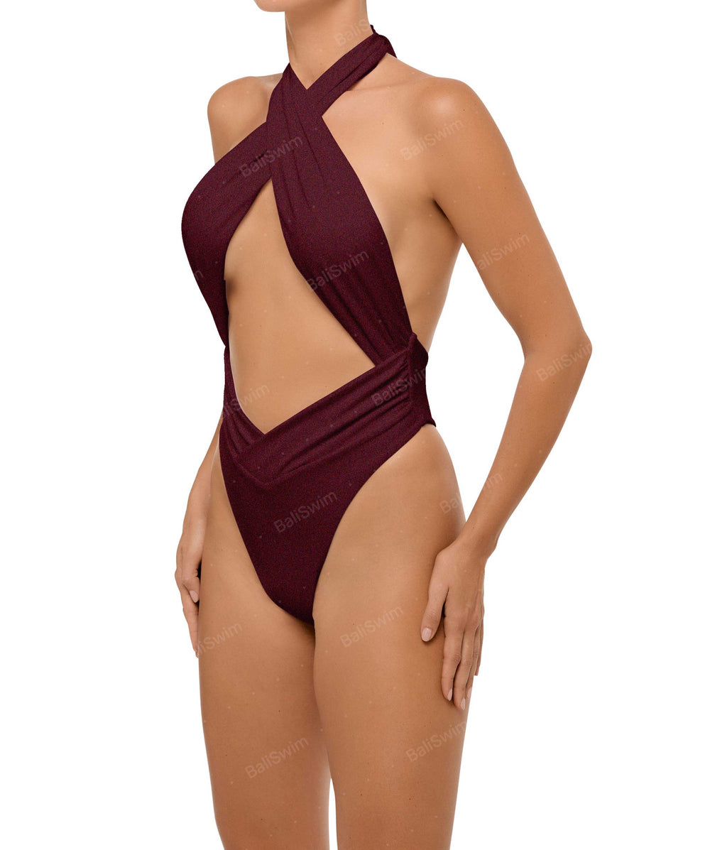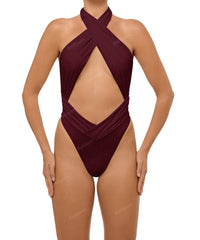 • Detail Feature: Halter cut out one piece, Adjustable halter ties, Criss cross neck, Ruched waist and side seam, Low V-waist, High cut, Low back