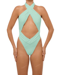 - Detail Feature: Halter cut out one piece, Adjustable halter ties, Criss cross neck, Ruched waist and side seam, Low V-waist, High cut, Low back