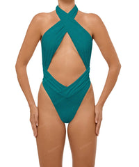 - Detail Feature: Halter cut out one piece, Adjustable halter ties, Criss cross neck, Ruched waist and side seam, Low V-waist, High cut, Low back