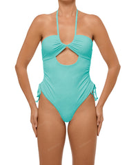 - Detail Feature: Versatile one piece, Adjustable halter ties, Front cutout, Side drawstring, High rise