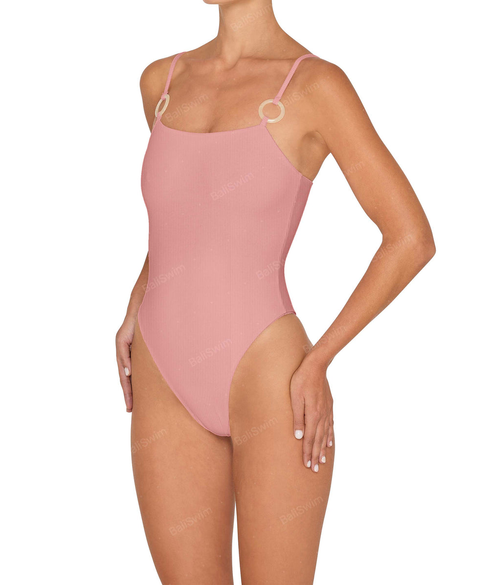 - Detail Feature: Straight neckline one piece, with resin ring details, high leg cut, seamless finishing, option fix straps/ adjustable