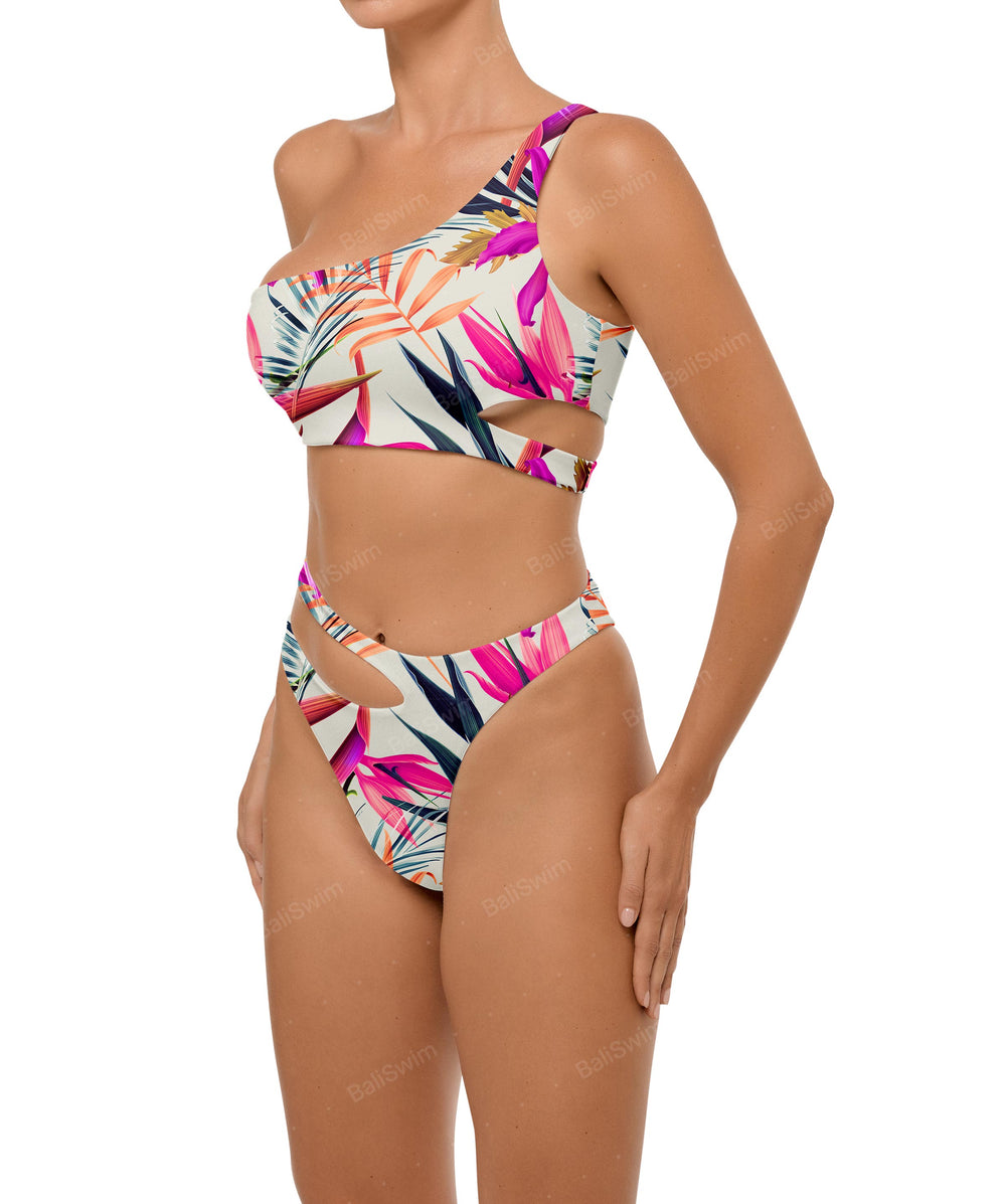 - Detail Feature: Asymmetric bikini top, Fixed shoulder strap, Side cut out detail, Pull on style