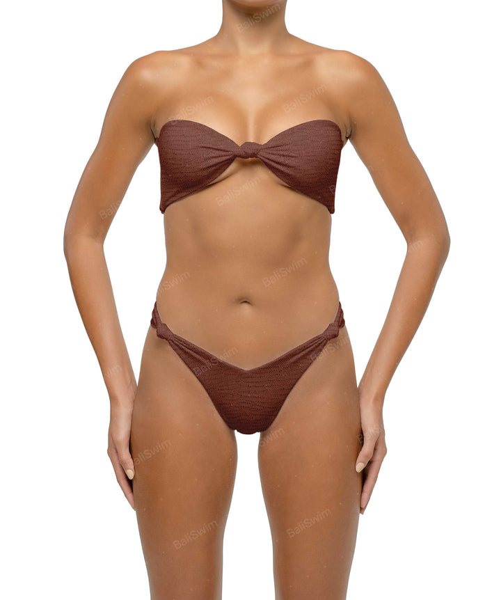 - Detail Feature: Bandeau bikini top, Sweetheart neckline, Front knottedd detail, Pull on style