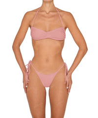 - Detail Feature: Halter bandeau top, center front ruching, with seamless finishing