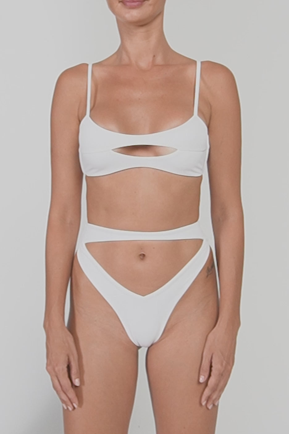 - Detail Feature: Hip cut out bikini bottom, High Rise, High cut