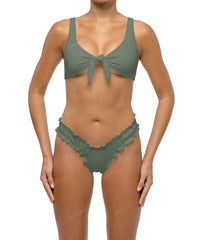 - Detail Feature: Lettuce hem bikini bottom, V-waist shape, Brazilian brief style, Low rise, High cut