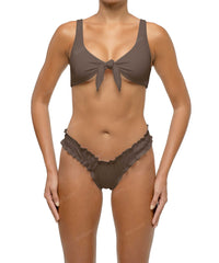 - Detail Feature: Lettuce hem bikini bottom, V-waist shape, Brazilian brief style, Low rise, High cut
