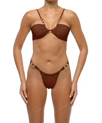- Detail Feature: Double rings bottom, Ruched detail, Adjustable front and bum coverage, Mid rise, High cut
