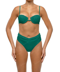 - Detail Feature: Front and back ruching detail, High rise, High cut, Brief style