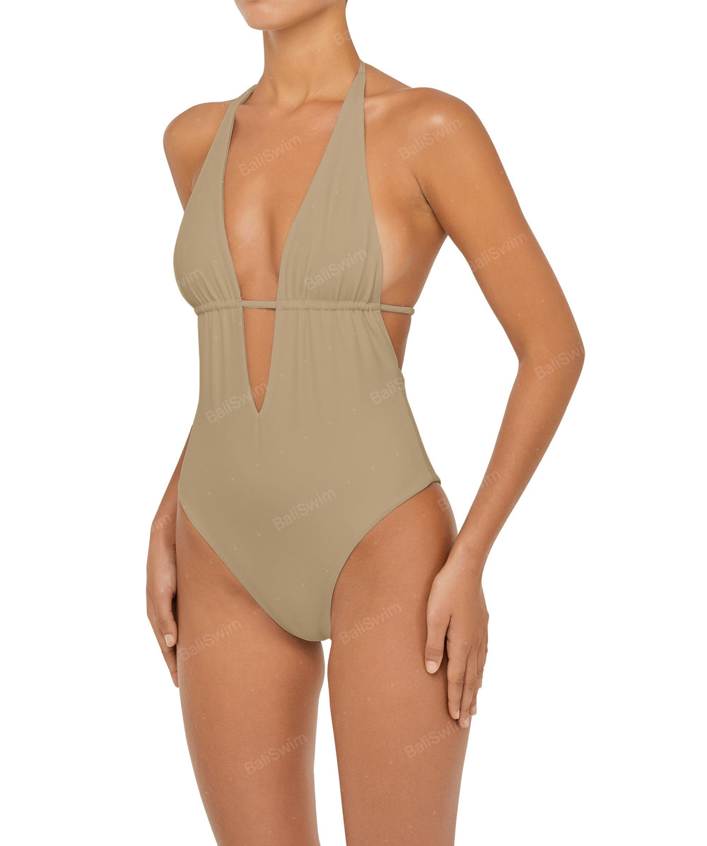 - Detail Feature: Plunge V-neck One piece, Halter ties, Adjustable underbust, Adjustable tie closure, Low back