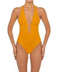 - Detail Feature: Plunge V-neck One piece, Halter ties, Adjustable underbust, Adjustable tie closure, Low back