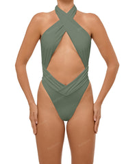 - Detail Feature: Halter cut out one piece, Adjustable halter ties, Criss cross neck, Ruched waist and side seam, Low V-waist, High cut, Low back
