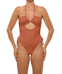 - Detail Feature: Versatile one piece, Adjustable halter ties, Front cutout, Side drawstring, High rise