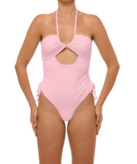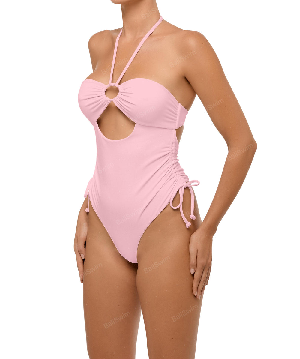 - Detail Feature: Versatile one piece, Adjustable halter ties, Front cutout, Side drawstring, High rise