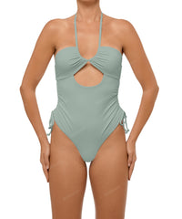 - Detail Feature: Versatile one piece, Adjustable halter ties, Front cutout, Side drawstring, High rise