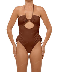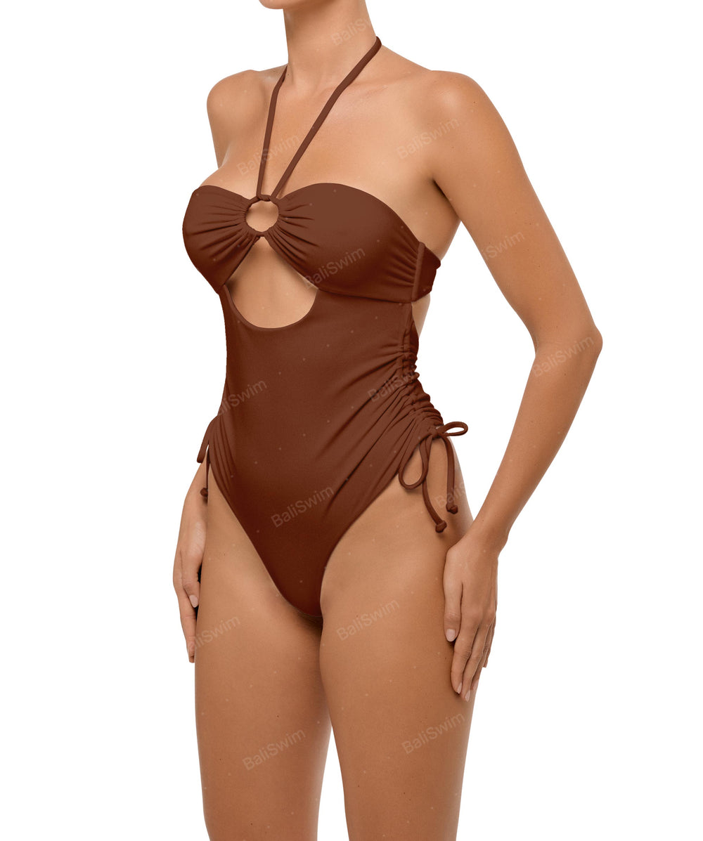 - Detail Feature: Versatile one piece, Adjustable halter ties, Front cutout, Side drawstring, High rise