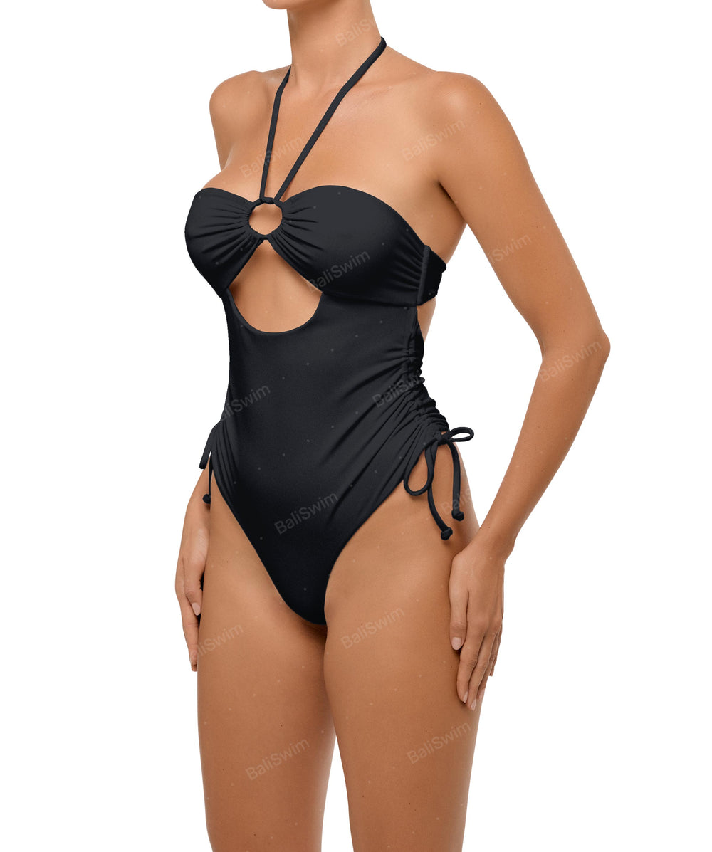 - Detail Feature: Versatile one piece, Adjustable halter ties, Front cutout, Side drawstring, High rise