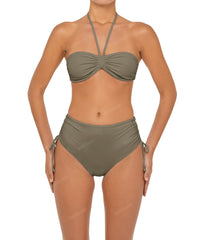 - Detail Feature: High rise bikini bottom, Adjustable leg opening option, Side ruched drawstrings detail, Hidden elastic band