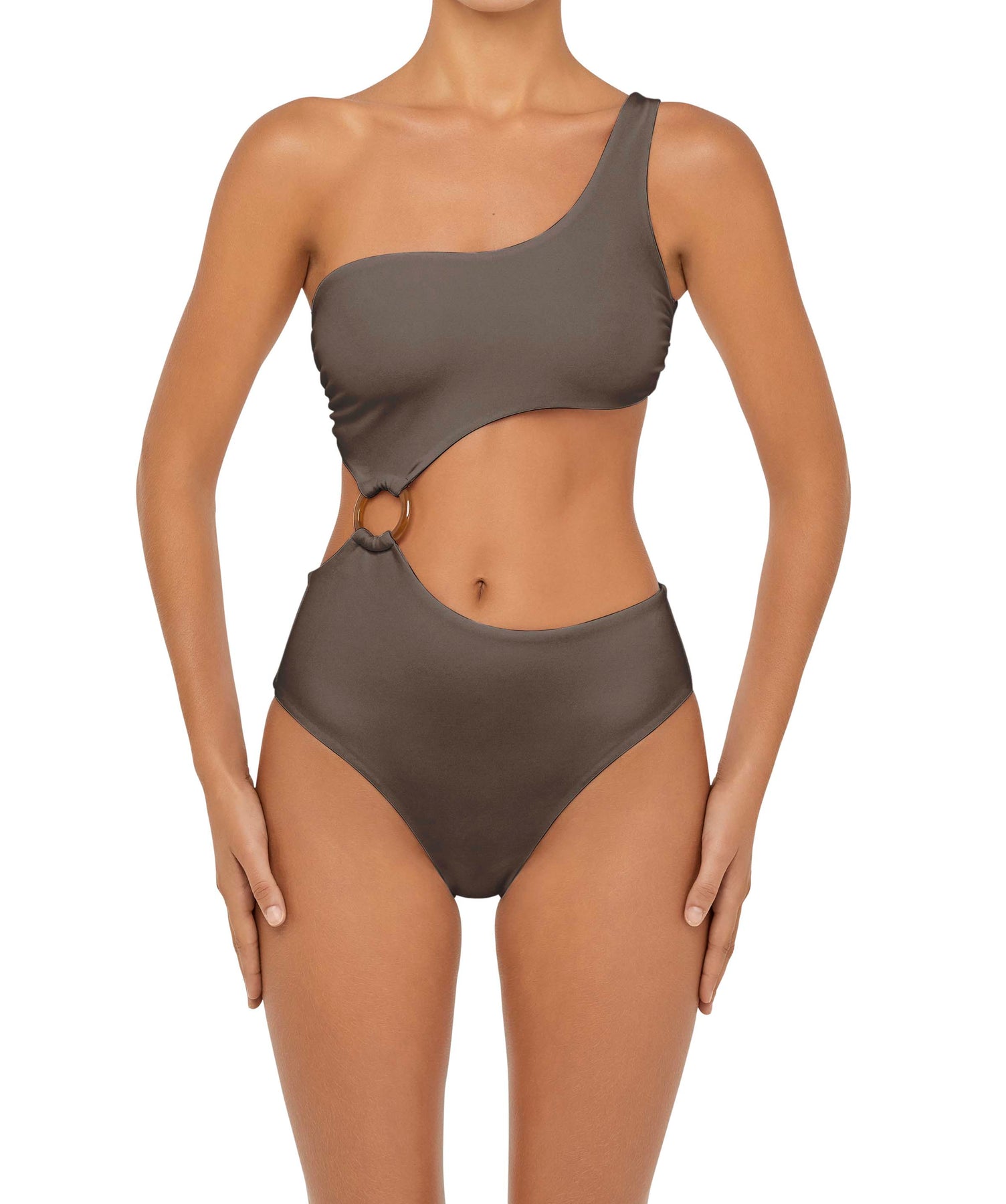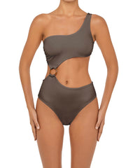 - Detail Feature: Asymmetric one-piece with a one-shoulder design, connecting O-ring cut-out detail, and a high-rise fit