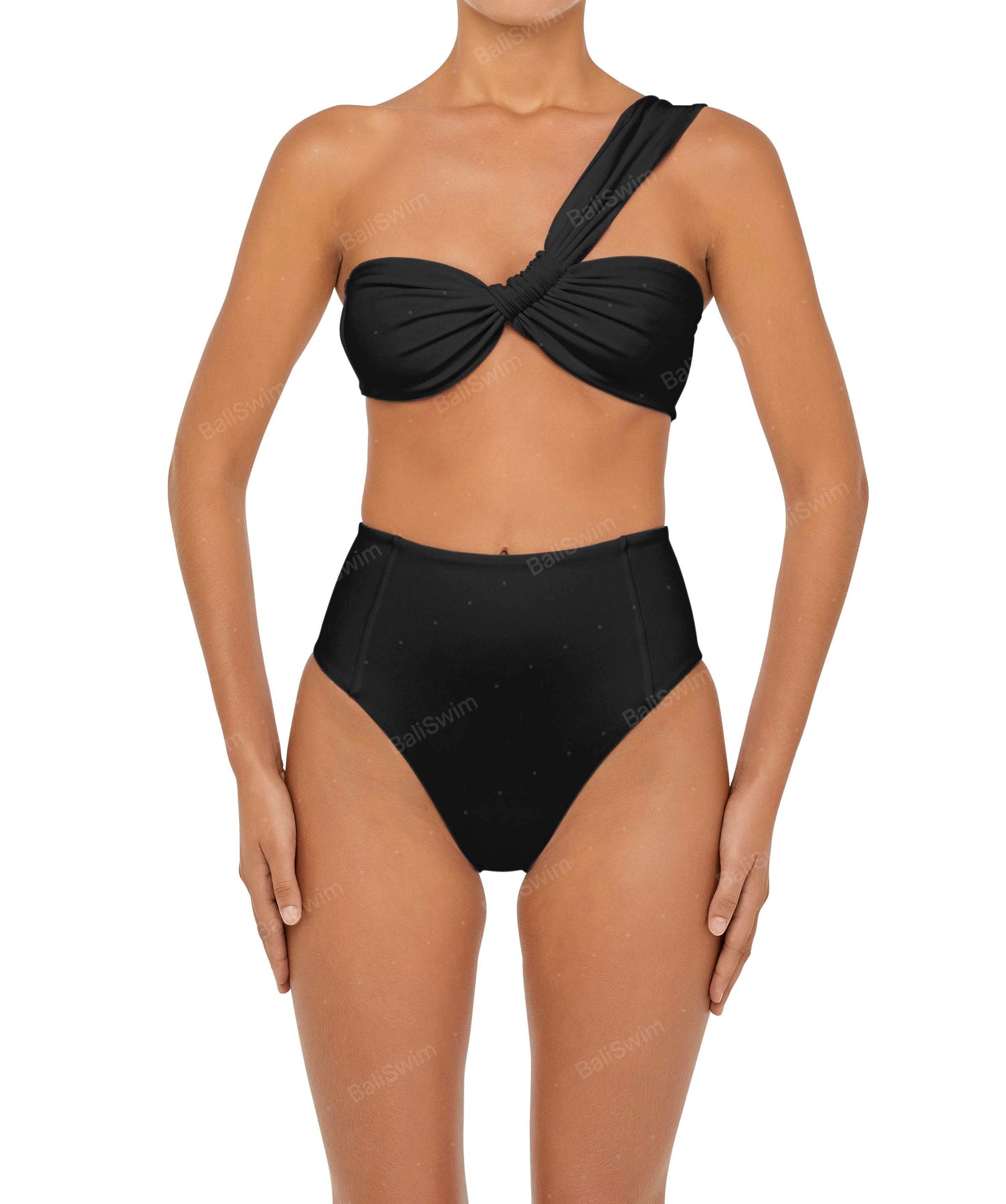 - Detail Feature: One shoulder bandeau bikini top, Ruched detail, Clasp closure