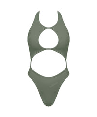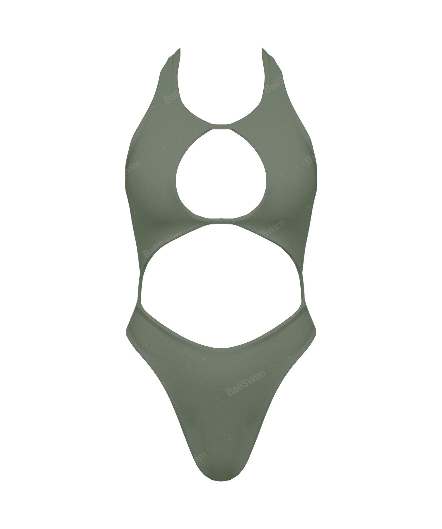 - Detail Feature: High-neck keyhole one-piece with cut-out details and a high-cut leg
