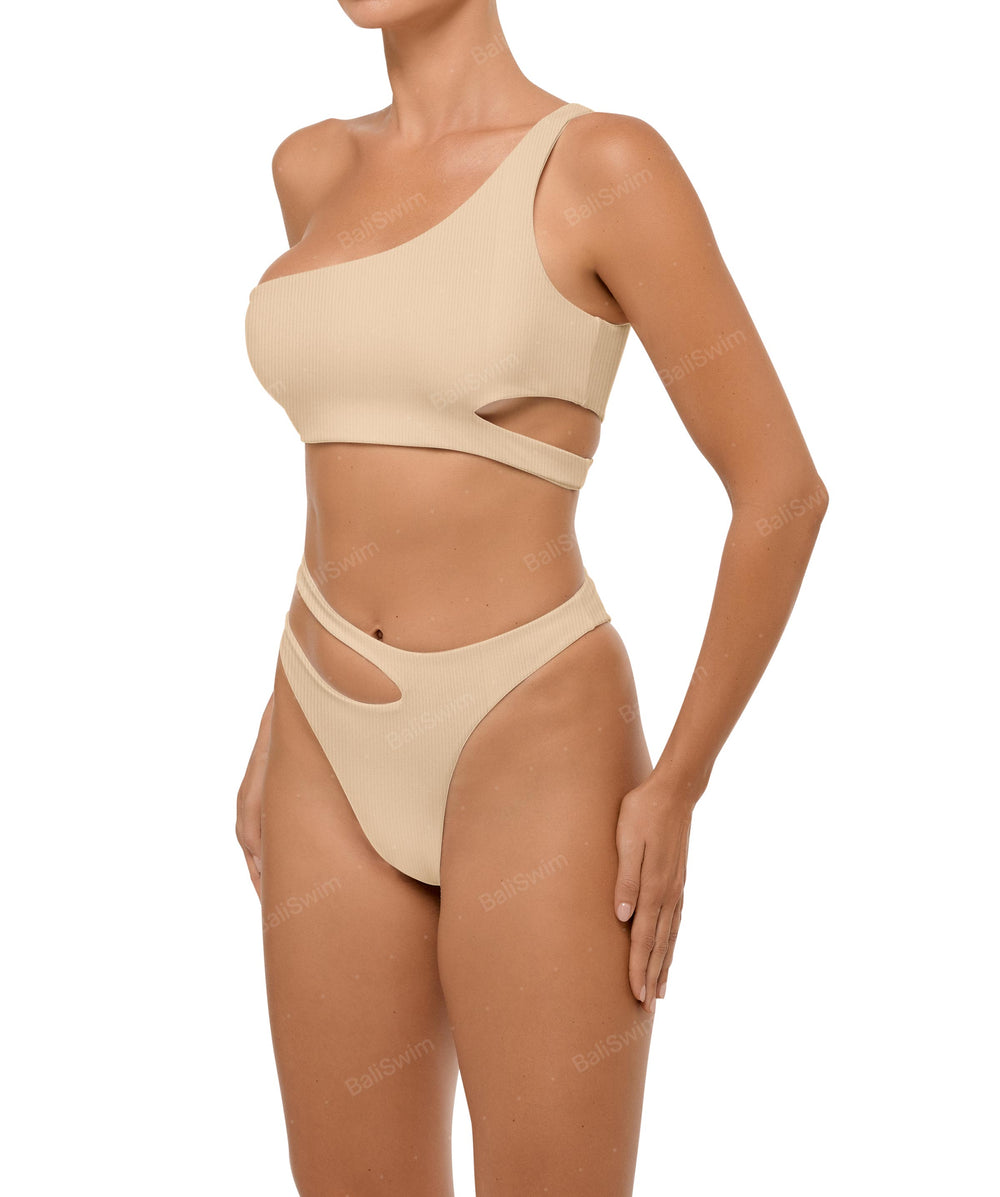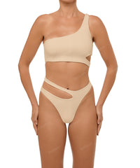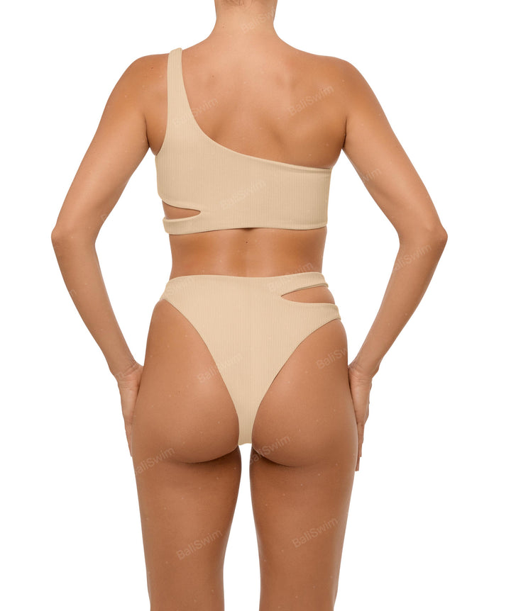 - Detail Feature: Asymmetric cut out bikini bottom, Mid rise, High cut