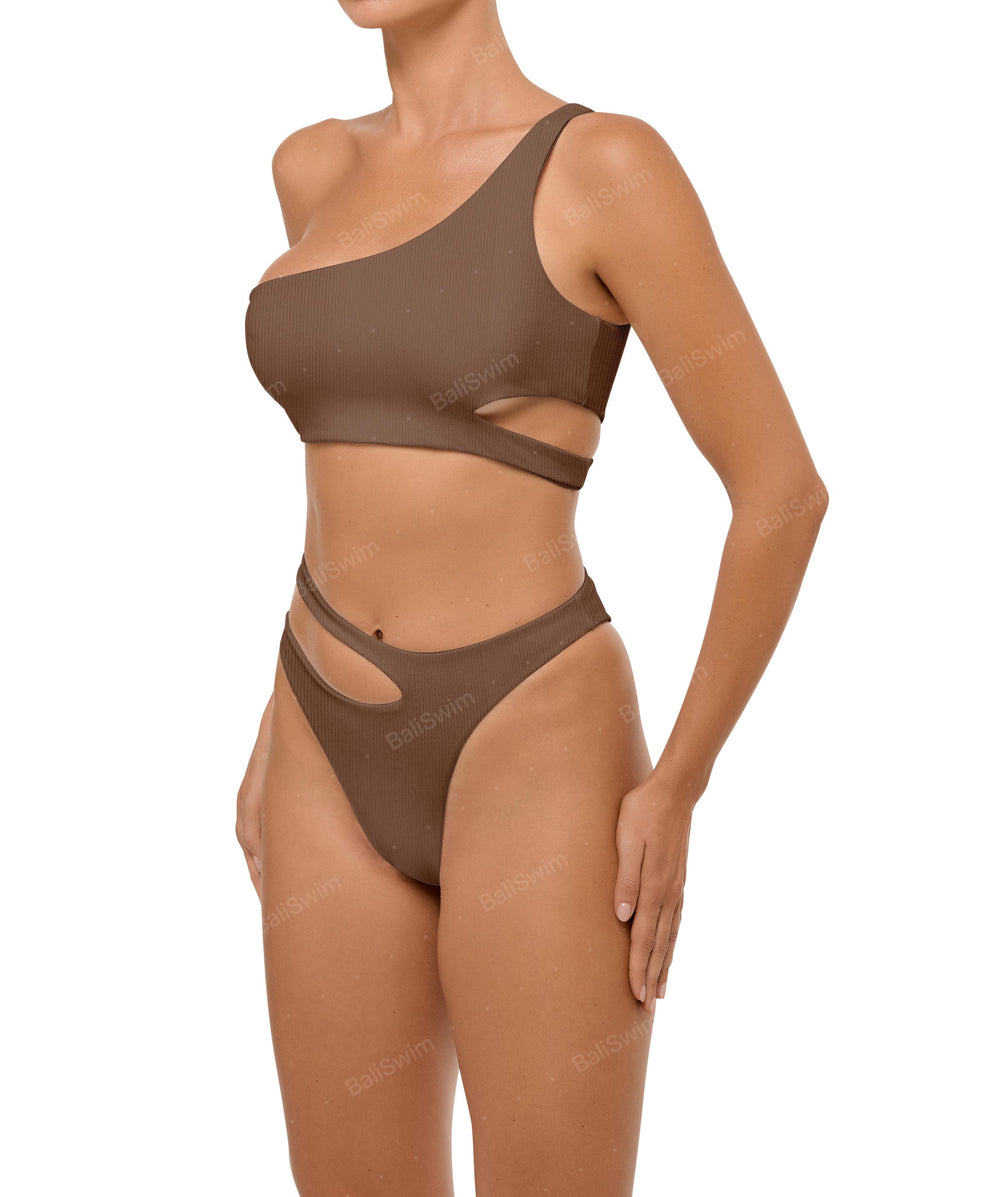 - Detail Feature: Asymmetric cut out bikini bottom, Mid rise, High cut