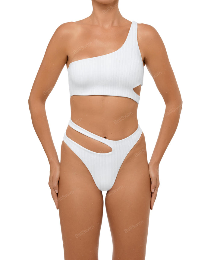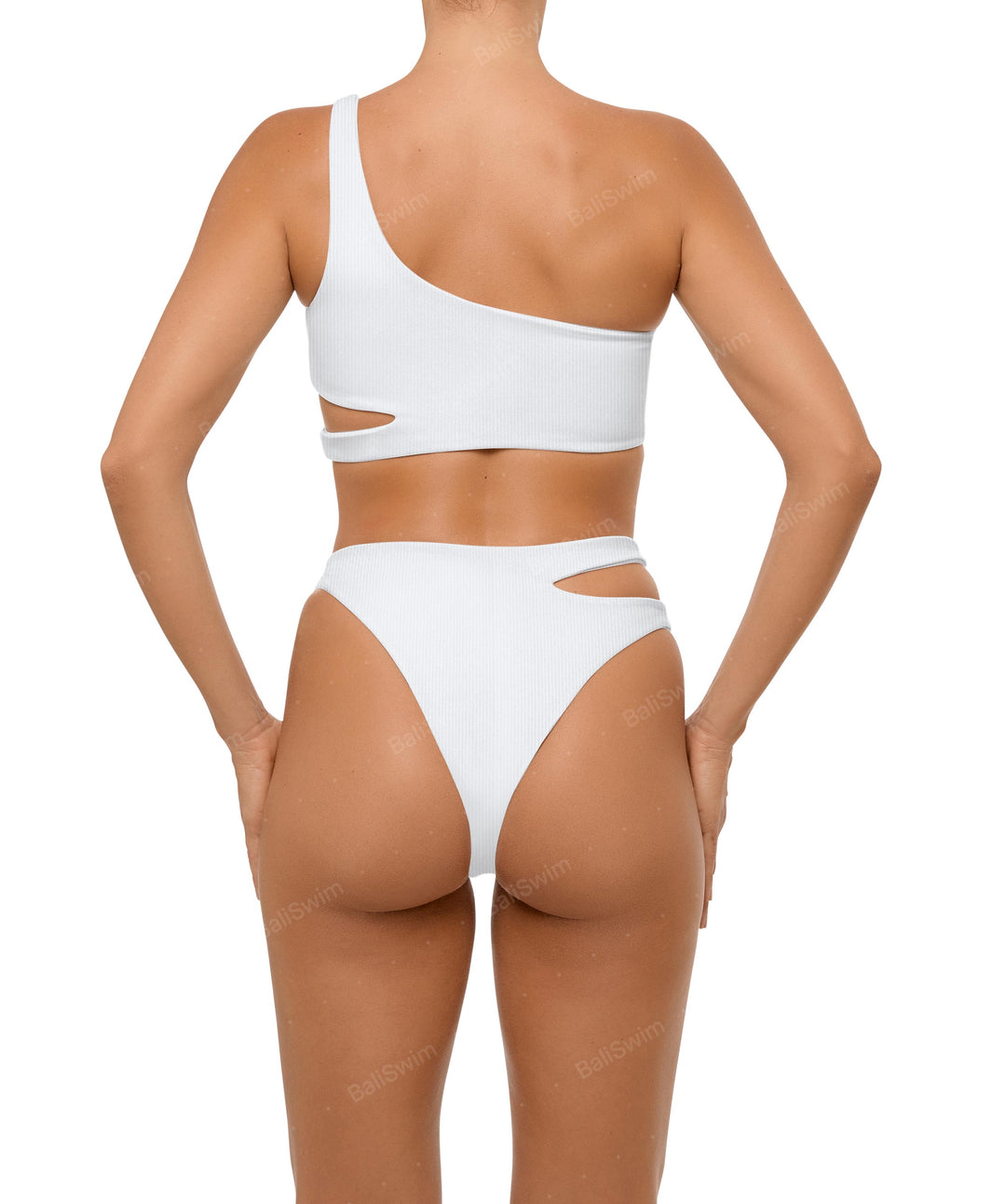 - Detail Feature: Asymmetric cut out bikini bottom, Mid rise, High cut