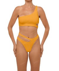 - Detail Feature: Asymmetric cut out bikini bottom, Mid rise, High cut