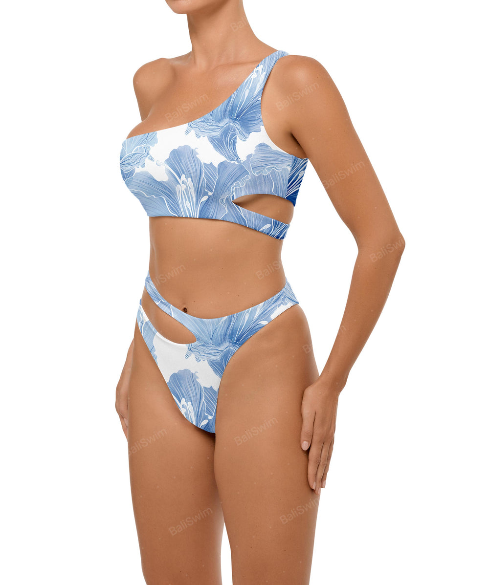 - Detail Feature: Asymmetric cut out bikini bottom, Mid rise, High cut