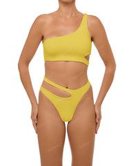 - Detail Feature: Asymmetric cut out bikini bottom, Mid rise, High cut