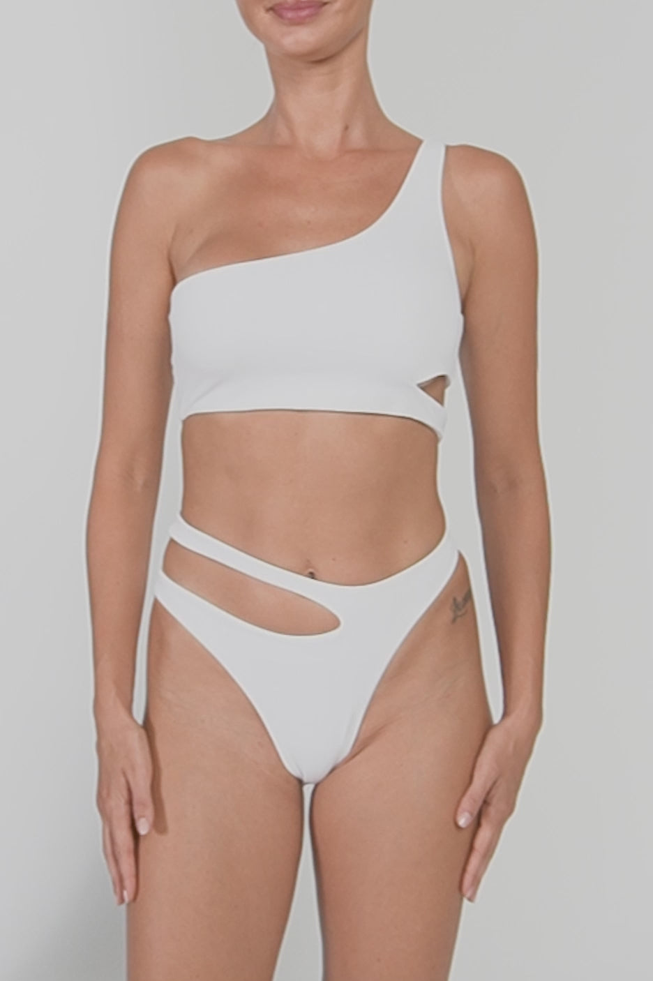 - Detail Feature: Asymmetric cut out bikini bottom, Mid rise, High cut