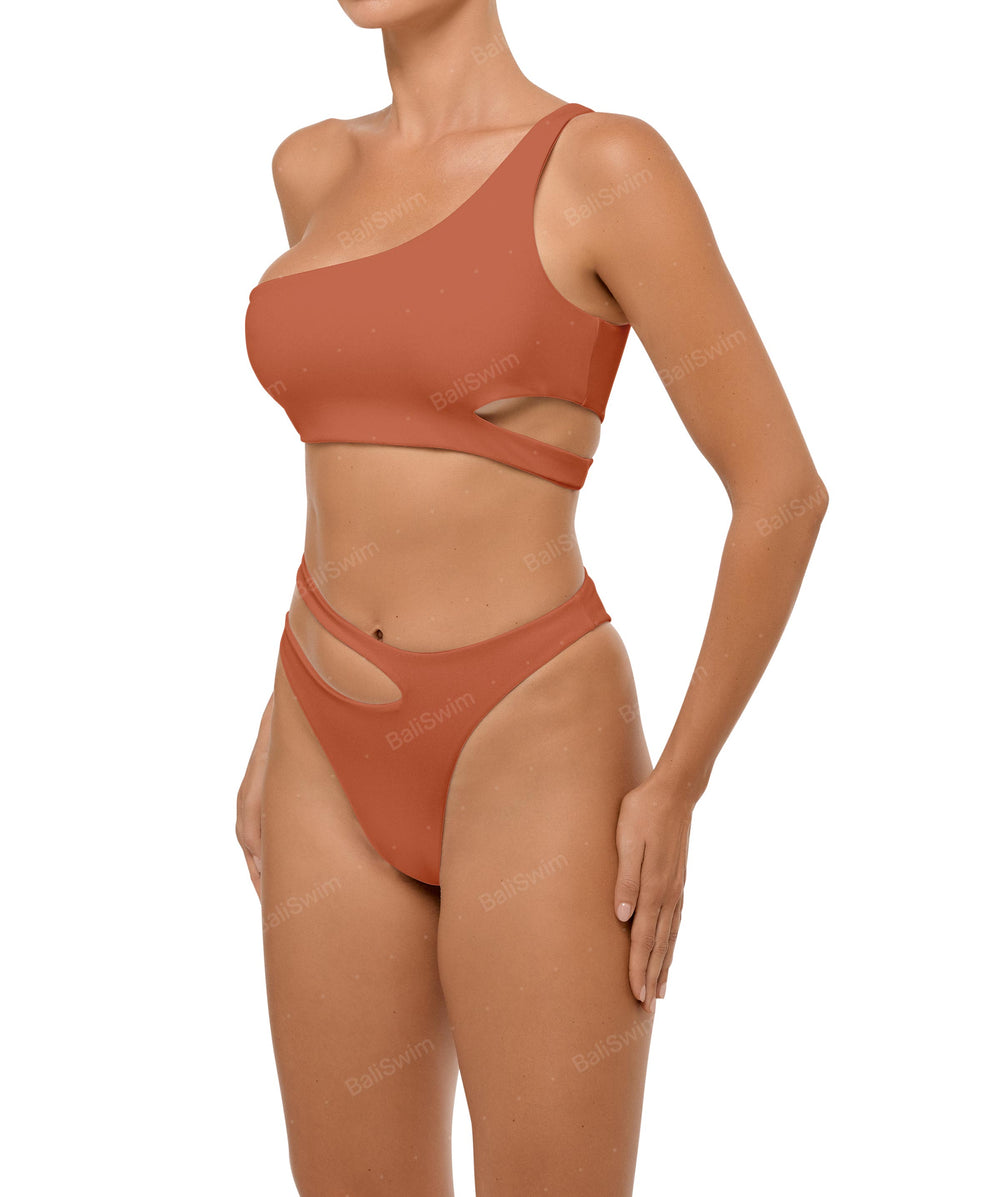 - Detail Feature: Asymmetric cut out bikini bottom, Mid rise, High cut