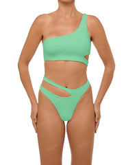 - Detail Feature: Asymmetric cut out bikini bottom, Mid rise, High cut