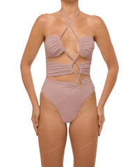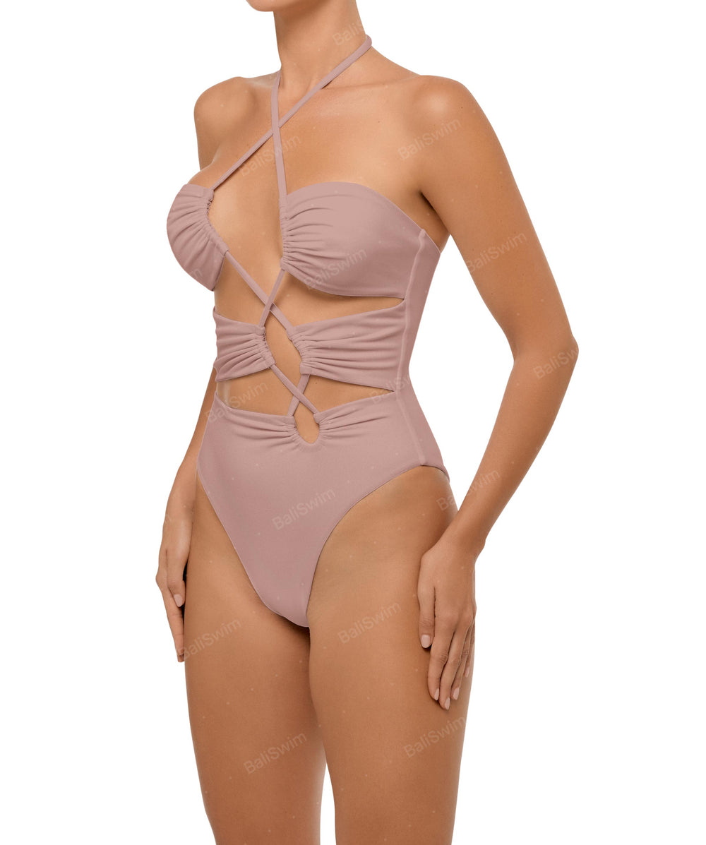 - Detail Feature: Asymmetric cut out one piece, Ruching detail, Adjustable criss cross halter neck