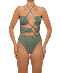 - Detail Feature: Asymmetric cut out one piece, Ruching detail, Adjustable criss cross halter neck
